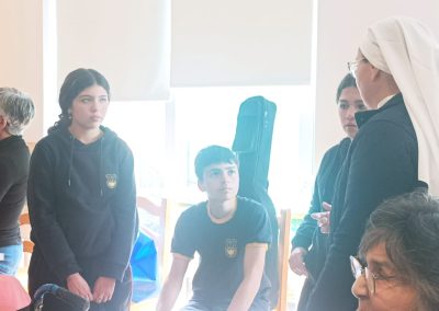 La jornada comenzó con una reunión junto al equipo directivo del colegio, donde se abordaron temas relevantes para la formación valórica y espiritual de los estudiantes, así como los desafíos actuales de la educación católica. Posteriormente, Monseñor Salas sostuvo un enriquecedor diálogo con docentes y asistentes de la educación, estudiantes y representantes de las diversas pastorales del colegio: padres, confirmación, primera comunión, movimiento carmelitano y fraternidad Ain Karem y Agar, agradeciendo su labor y animándolos a continuar siendo testimonio vivo del Evangelio en el aula. Este espacio de encuentro fue especialmente significativo, ya que permitió compartir experiencias de fe, compromiso comunitario y el trabajo que se realiza en cada uno de estos grupos al interior de la comunidad educativa.
