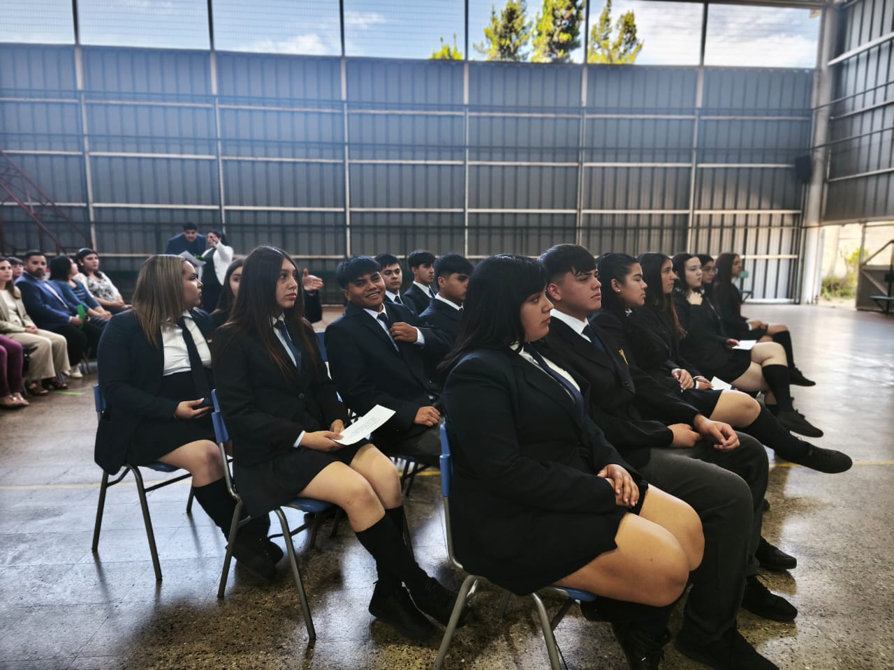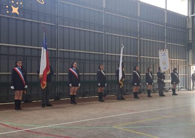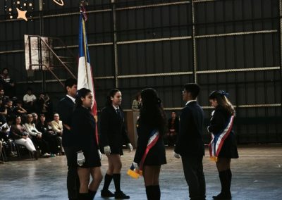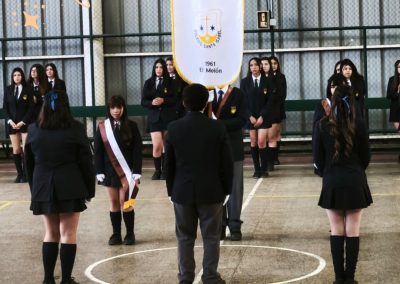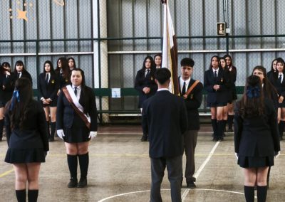 Las escoltas Emilia Fernanda Zúñiga Peñaloza (4°A) y Lorena Escudero de Sousa (4°B) entregaron las bandas del Pabellón Nacional a Martina Ignacia Muñoz Puebla y Antonia Alejandra López Olivares (3°B). El Estandarte Nacional fue entregado por Óscar Elías Díaz Tello (4°A) a Leonel Antonio de Jesús Herrera (3°B).
